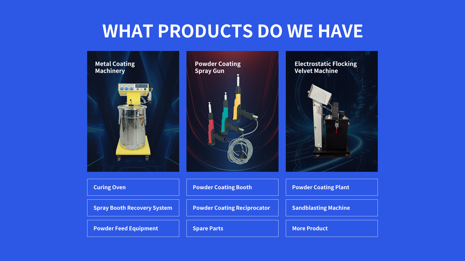 Electrostatic Powder Spraying Equipment applies electrically charged powder particles to grounded surfaces, ensuring efficient adhesion. Core components include an electrostatic spray gun, powder hopper, high-voltage generator, conveyor system, and curing oven.